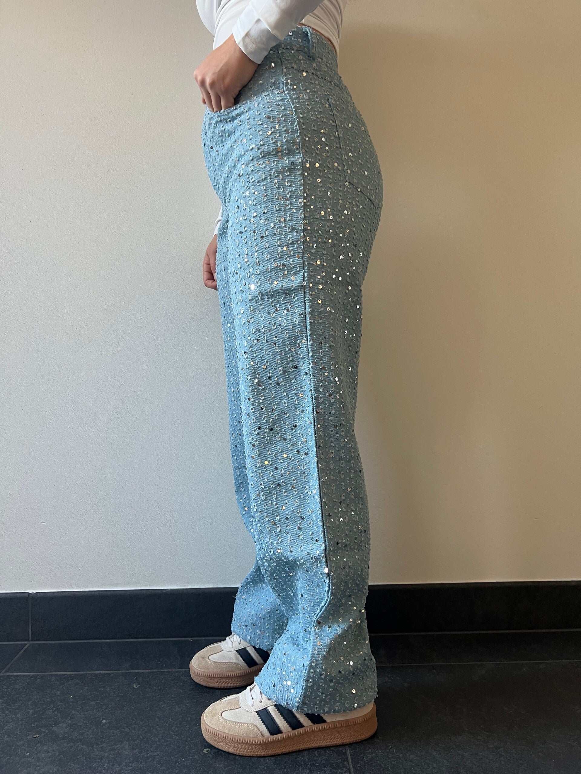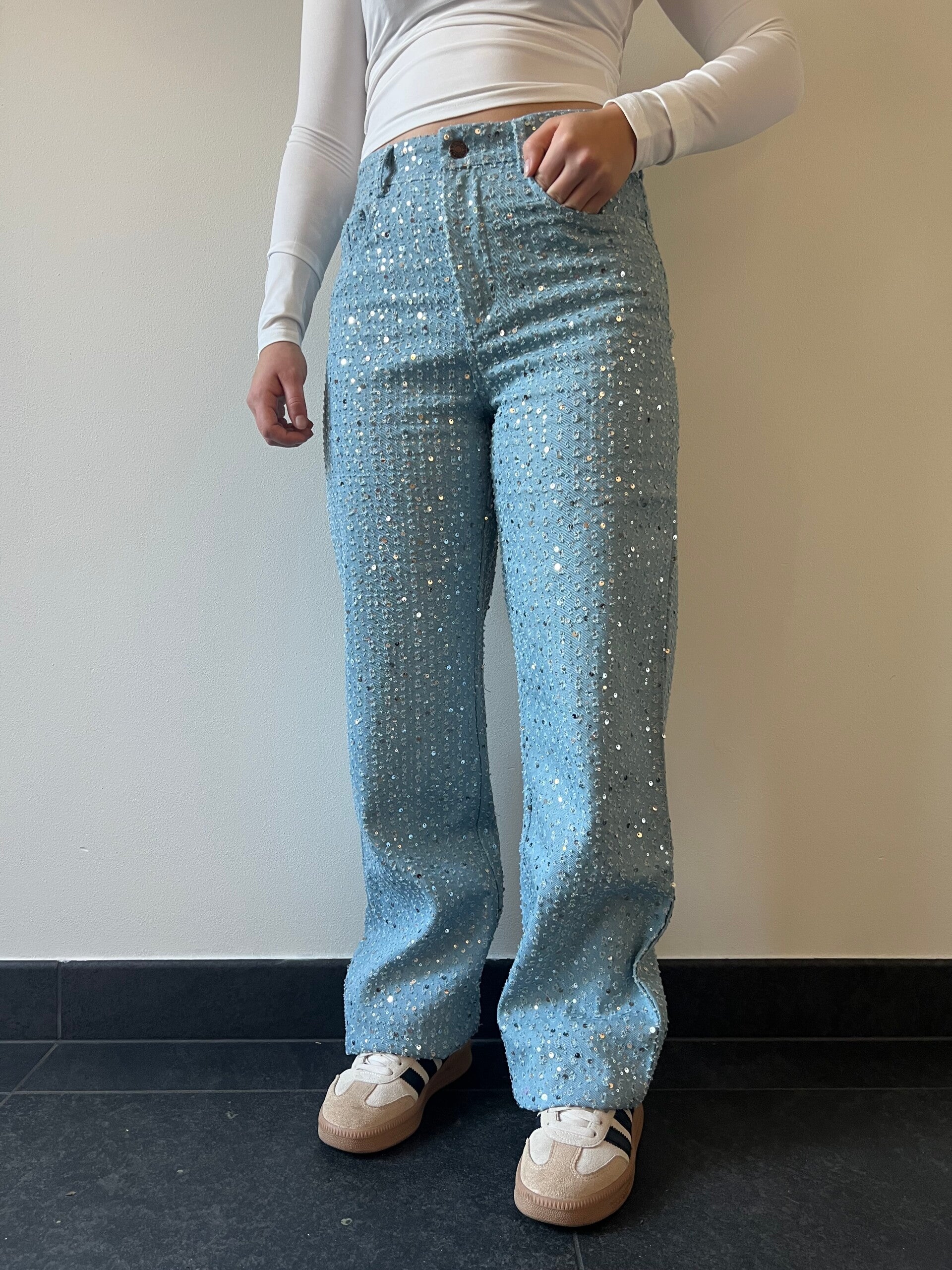 De Lumi Jeans is dé perfecte mix tussen stoer en feestelijk! Deze lichtblauwe jeans is afgewerkt met glitter pailletten die direct een feestelijke uitstraling geven. De frisse denimkleur maakt ‘m makkelijk te combineren, terwijl de pailletten jouw look net dat extra'tje geven. Zo blijft je outfit altijd shiny, ook als je een keer geen jurk of rok wilt dragen!